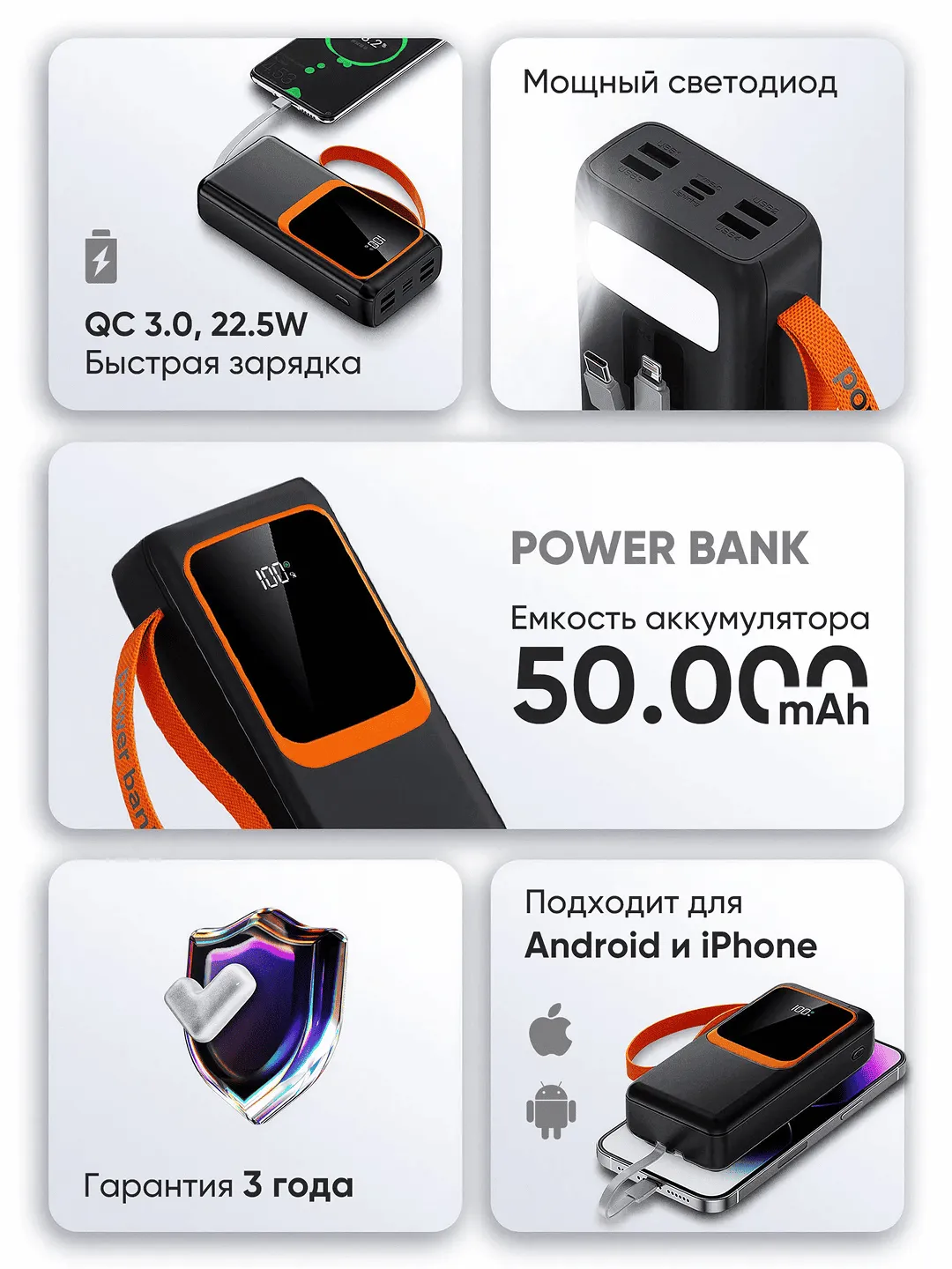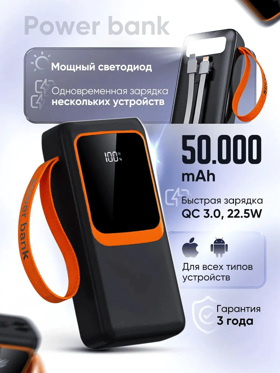 📱 Зависит от модели. iPhone 14 — около 10–12 раз, Samsung Galaxy — 8–10 раз, планшет — 3–4 раза. 50,000 mAh хватает на несколько дней без розетки.