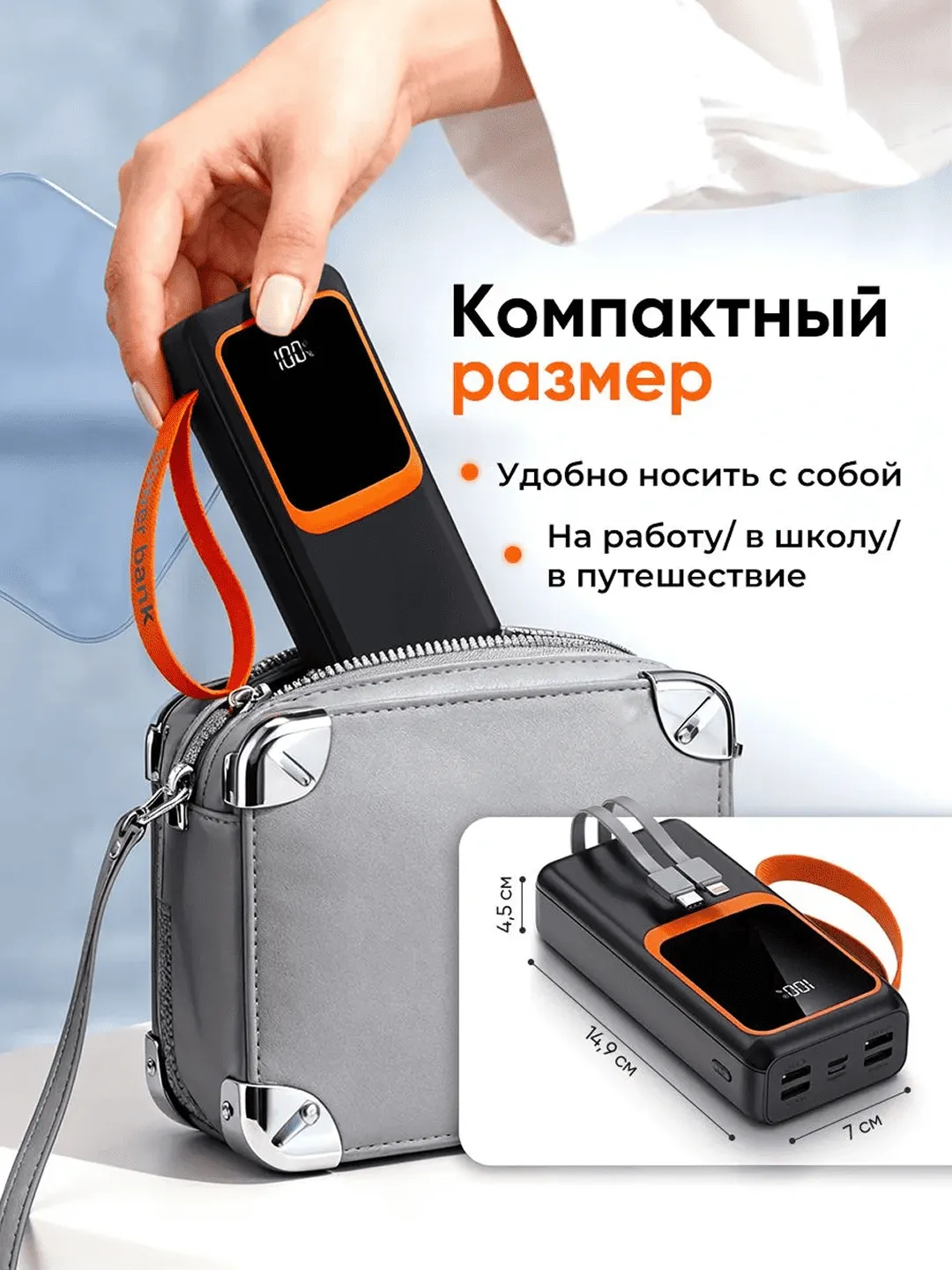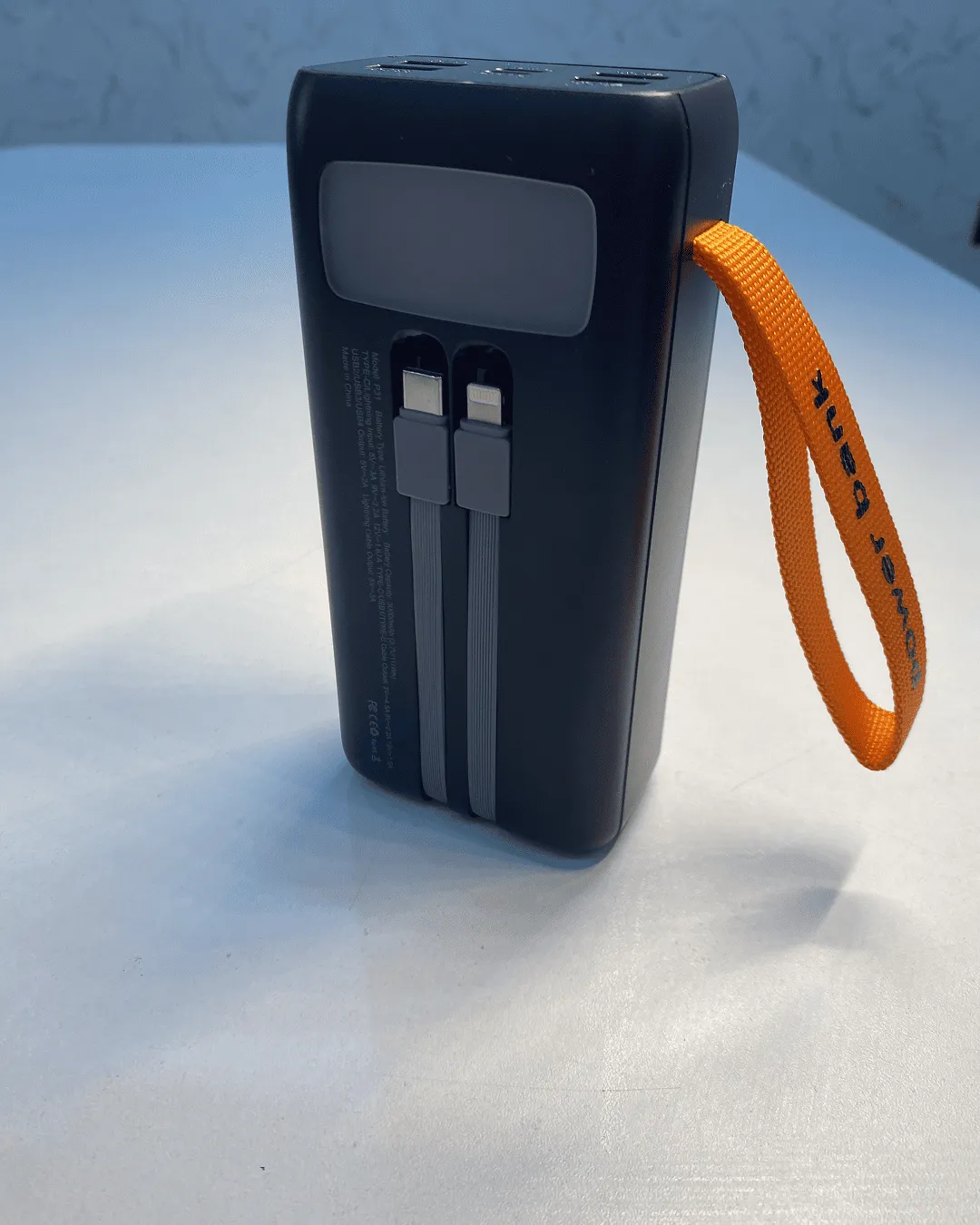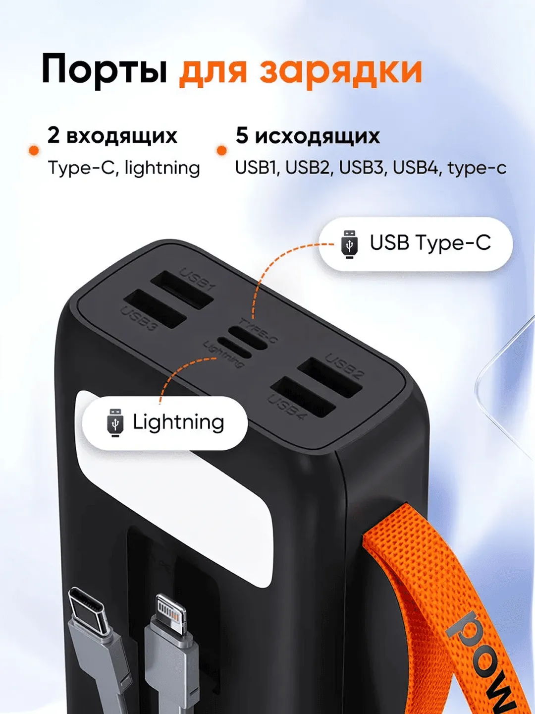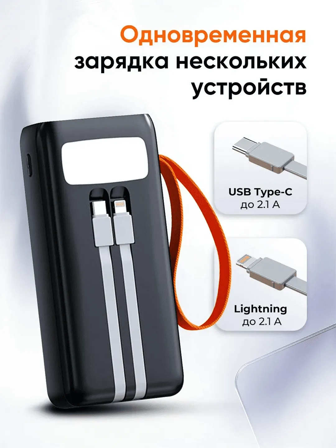 ✅ Оба кабеля — Type-C и Lightning — уже встроены в корпус повербанка. Ничего докупать не нужно. Достал из коробки — сразу готов к использованию.