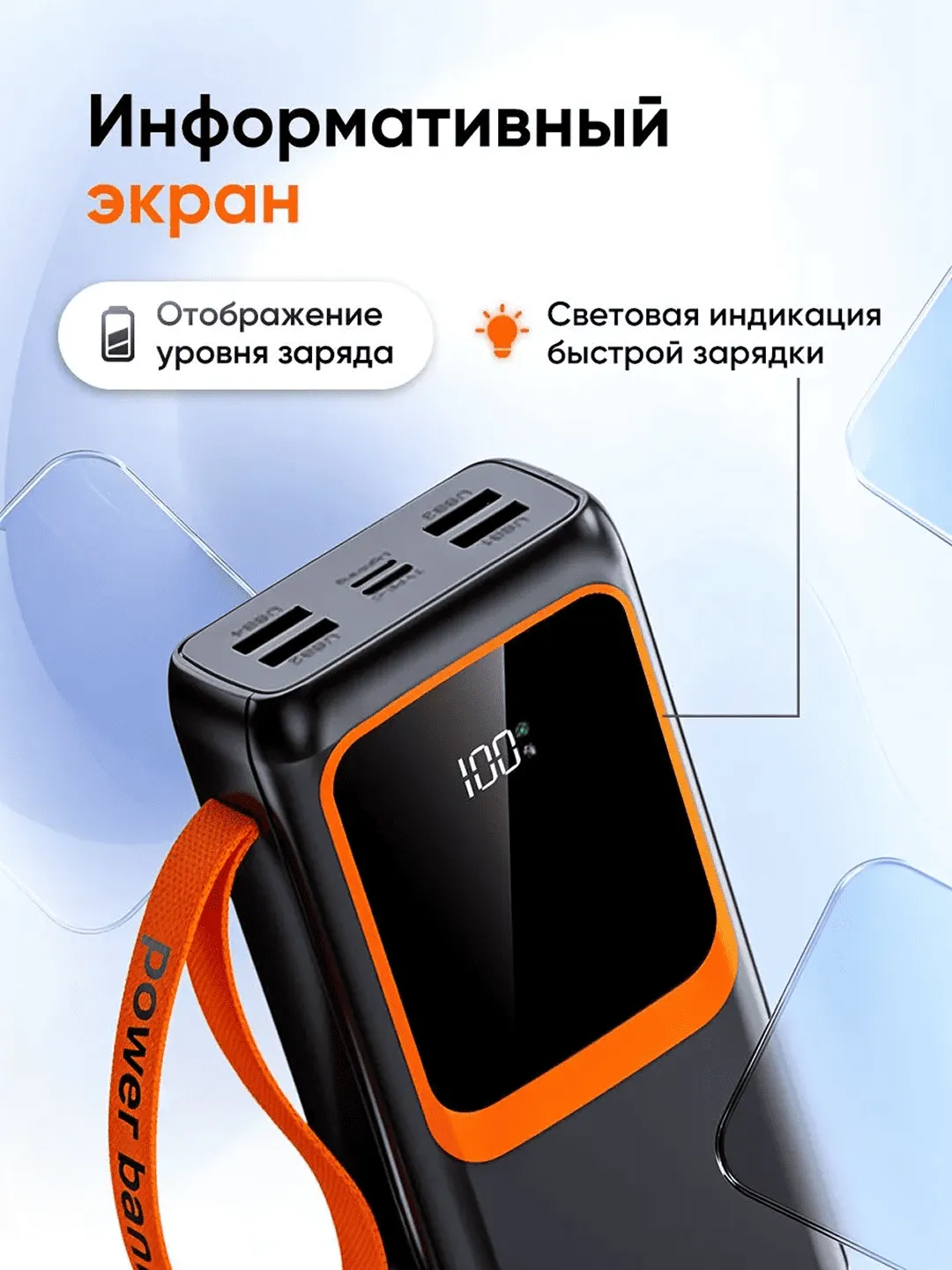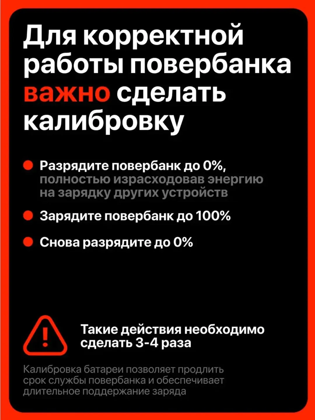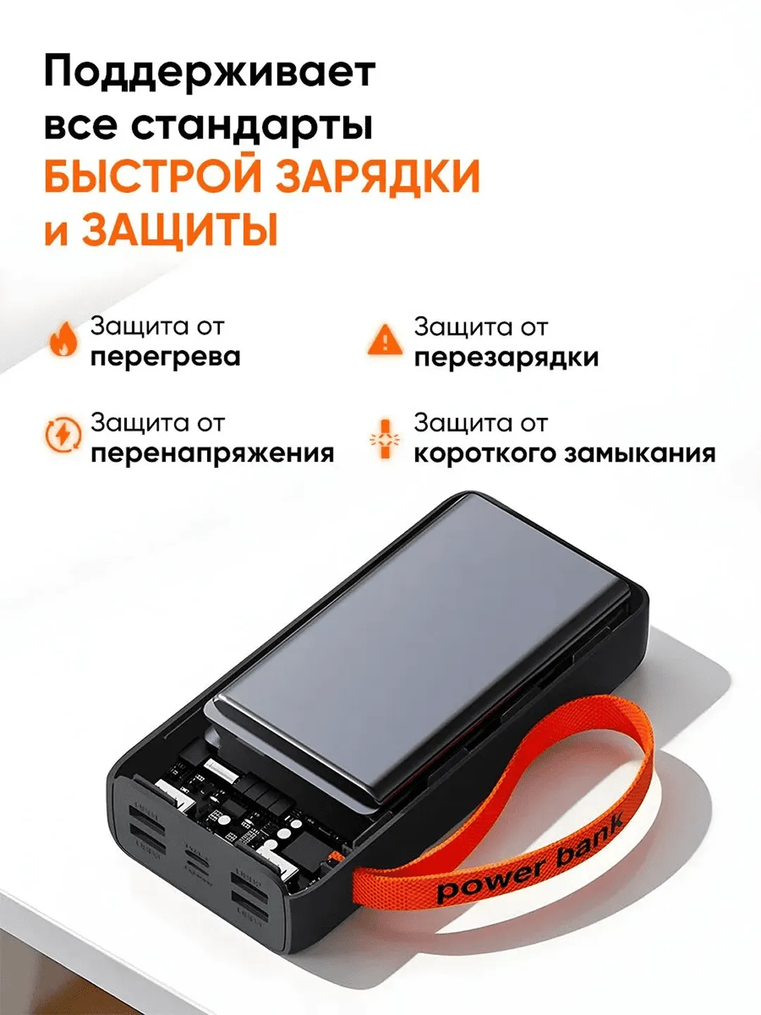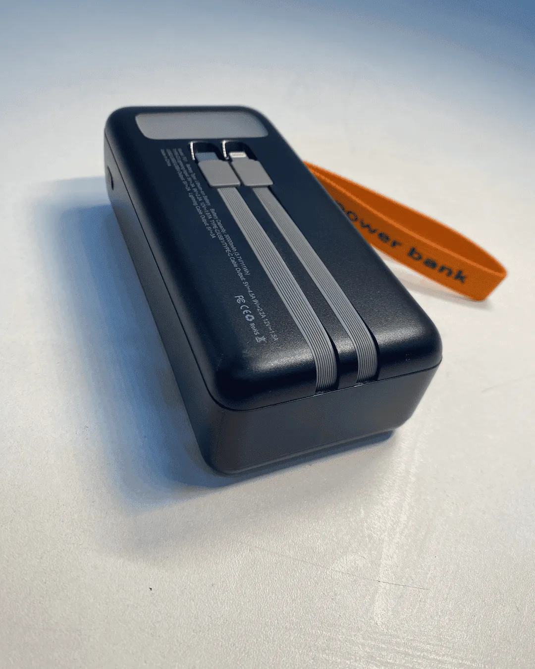 ✅ Оба кабеля — Type-C и Lightning — уже встроены в корпус повербанка. Ничего докупать не нужно. Достал из коробки — сразу готов к использованию.