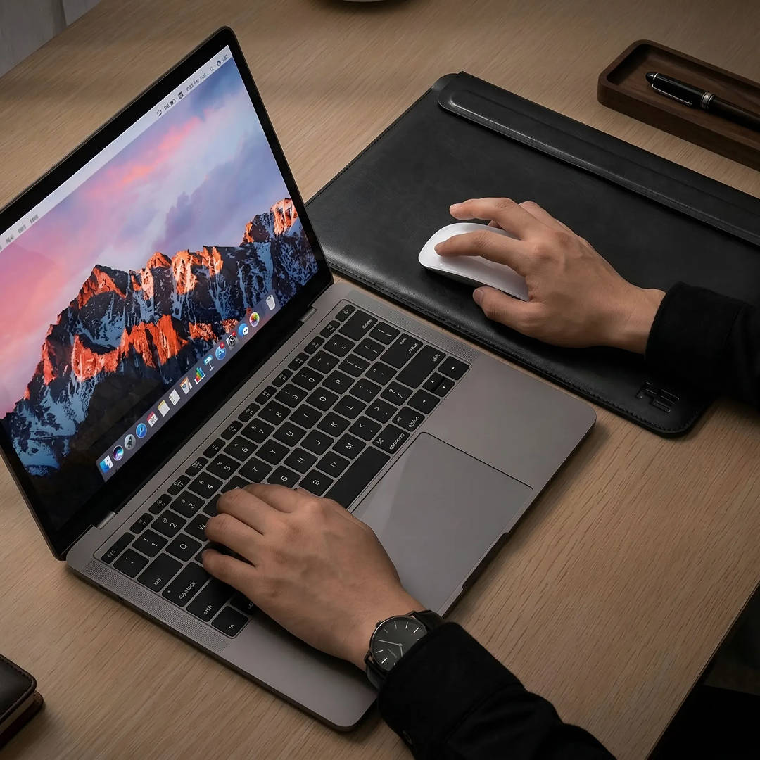 ℹ️ Основной отсек рассчитан на ноутбук. Чехол выполнен в минималистичном стиле без дополнительных карманов — акцент на тонкий профиль и премиальный вид. Для мышки и кабелей рекомендуется отдельный органайзер.