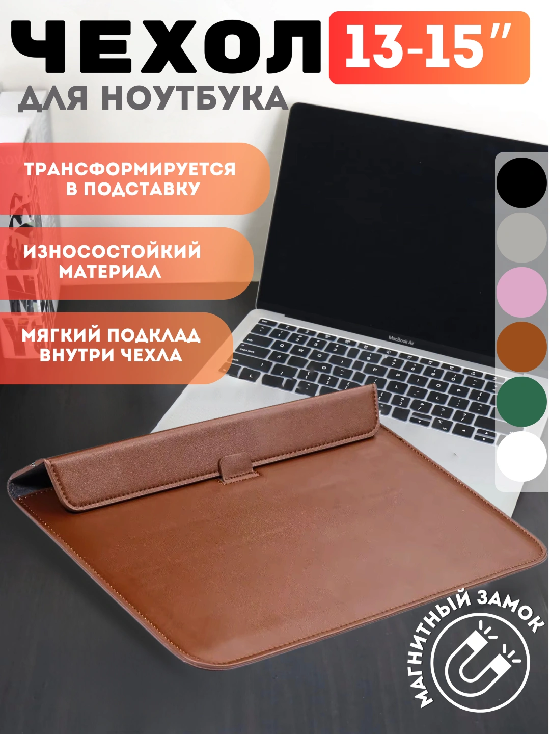 Чехол красивый, аккуратно упакован и прислан, цвет как на фото, прошитый качественно!!! Прекрасный за свою цену, магниты крепкие, macbook pro 13” 2019 влез идеально даже осталось немного места, удобная подставка чтобы не нагревался. Рекомендую данный чехол, спасибо большое продавцу!!! Покупаю чехол второй раз в качестве подарка , качество огонь , никаких заломов и потертостей я не обнаружила.
