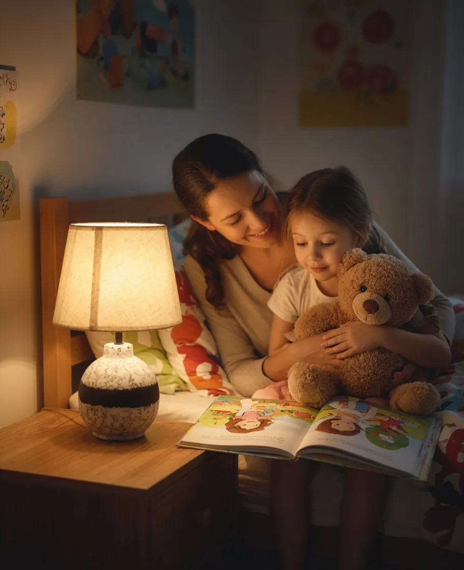 Да — мягкий рассеянный свет идеален для детской. Не слепит, создаёт спокойную атмосферу перед сном. Основание устойчивое, не опрокидывается.