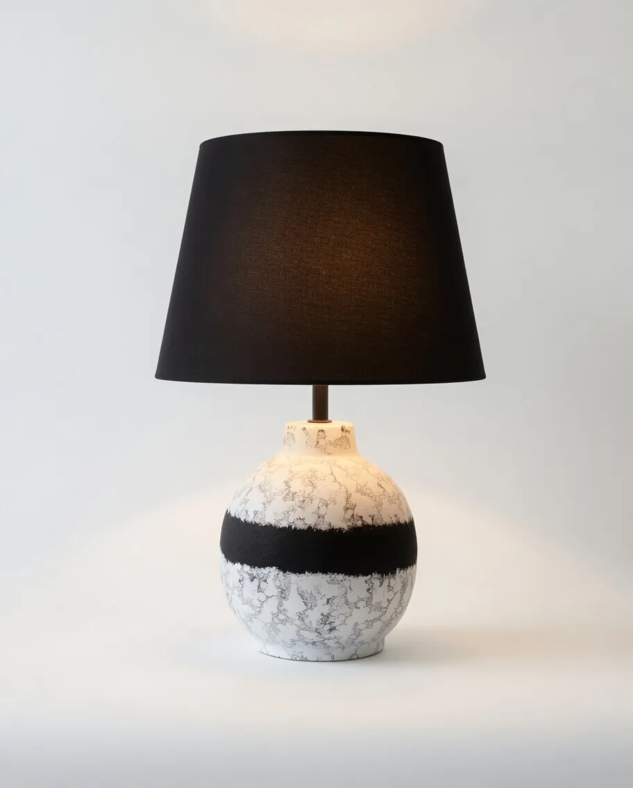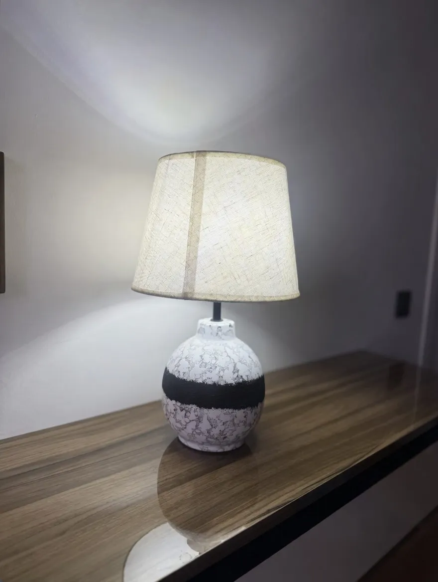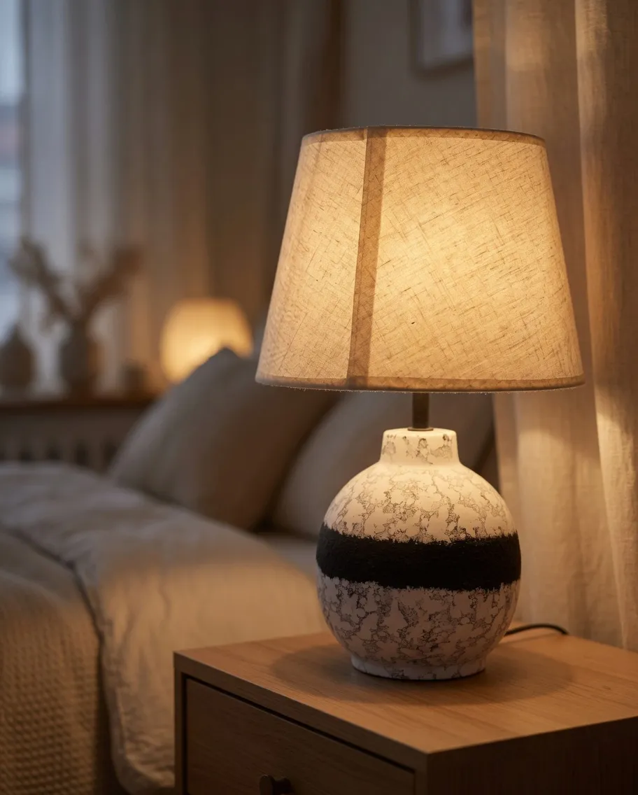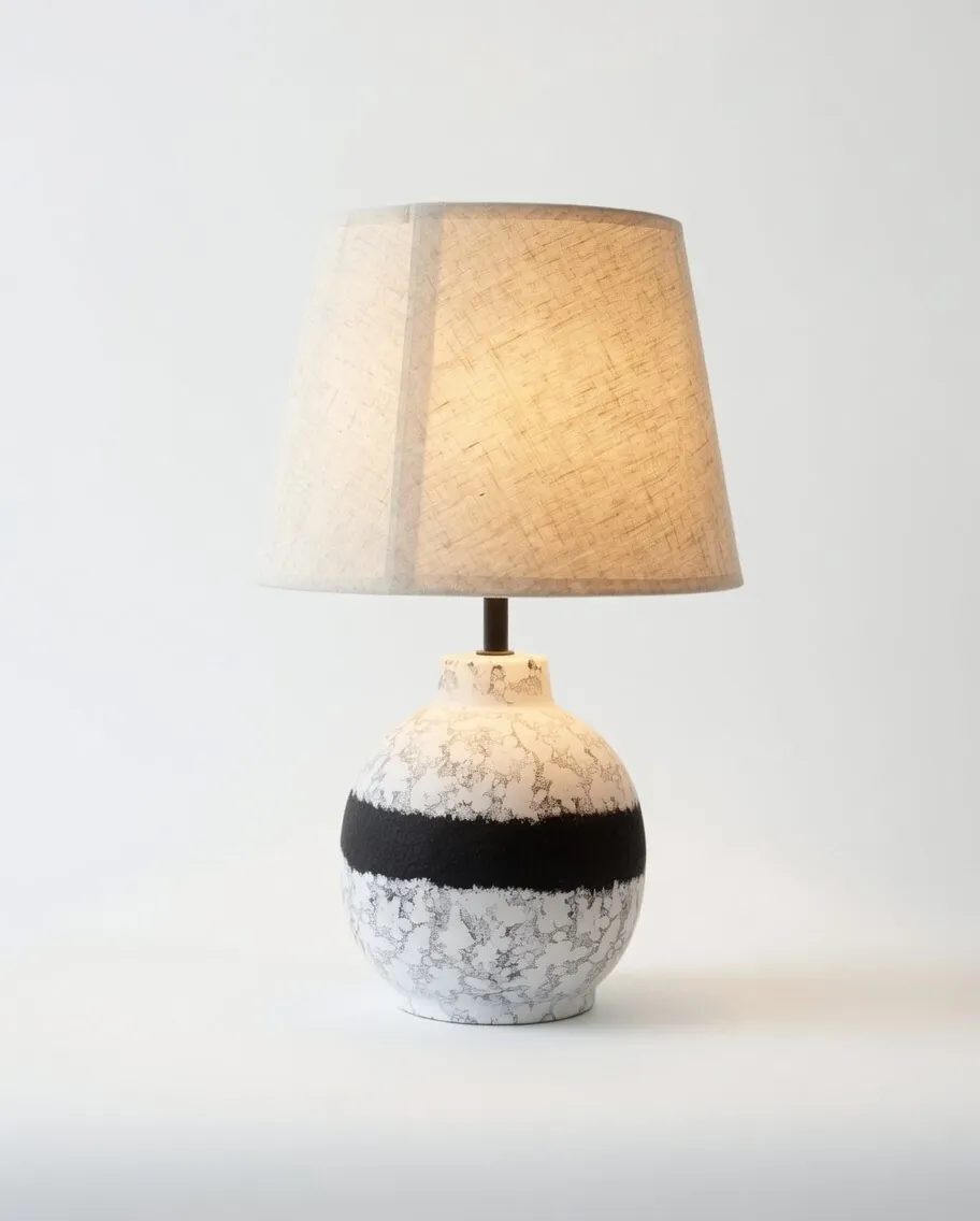 Нейтральный бело-серый цвет с мраморным узором сочетается с любым интерьером — скандинавский, классический, современный, минимализм. Льняной абажур бежевого тона тоже универсальный.