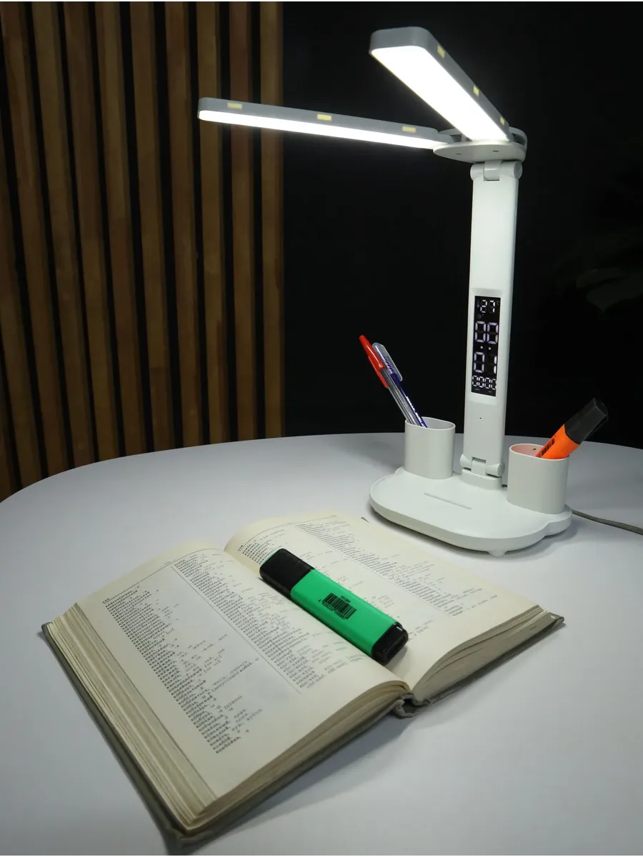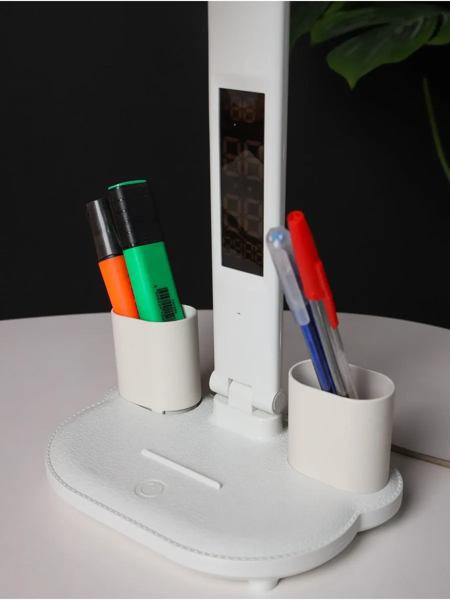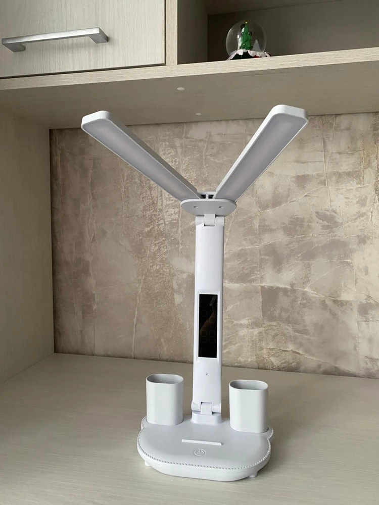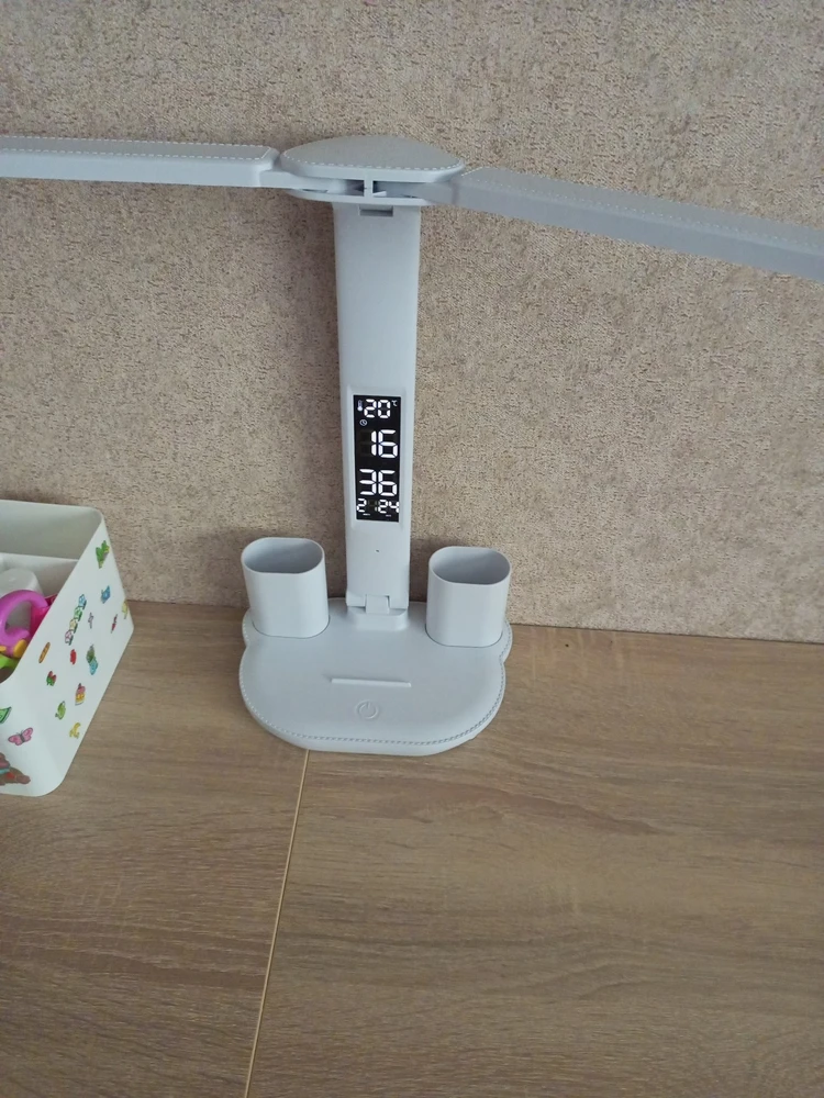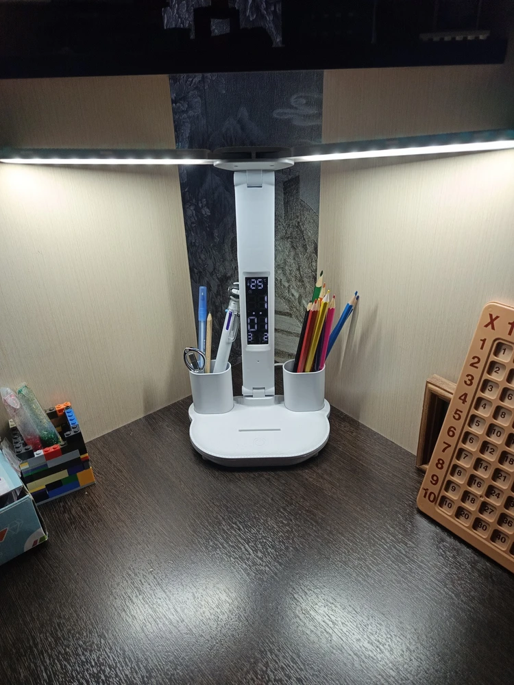 Регулируемая интенсивность света, разные режимы освещения. Удобные емкости для хранения ручек. Приятно, что есть встроенная батарея и при неожиданном отключении света, лампа продолжает работать, освещая рабочий стол и согревая душу)