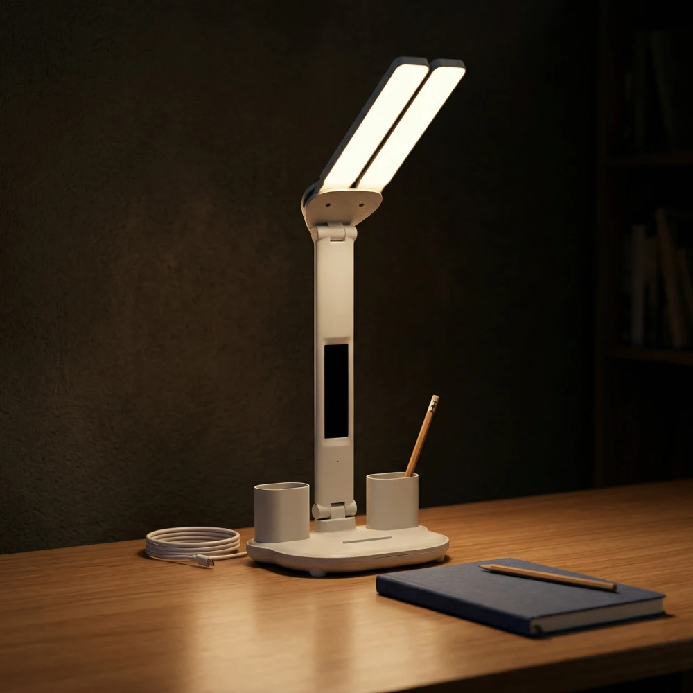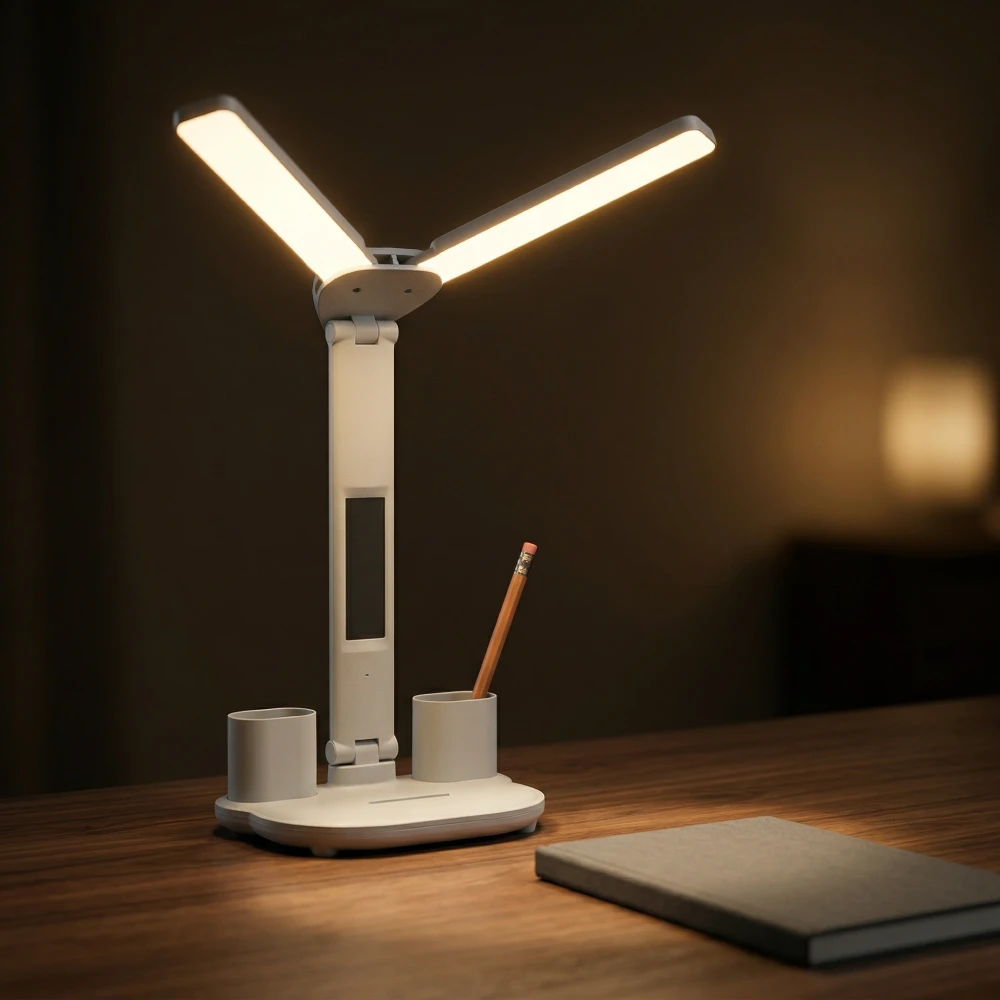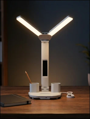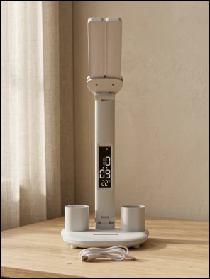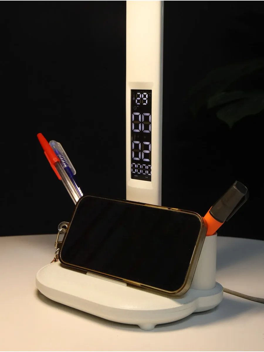 Регулируемая интенсивность света, разные режимы освещения. Удобные емкости для хранения ручек. Приятно, что есть встроенная батарея и при неожиданном отключении света, лампа продолжает работать, освещая рабочий стол и согревая душу)